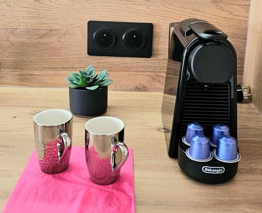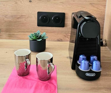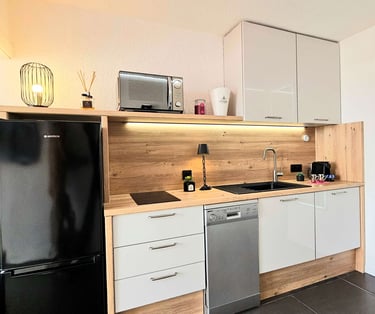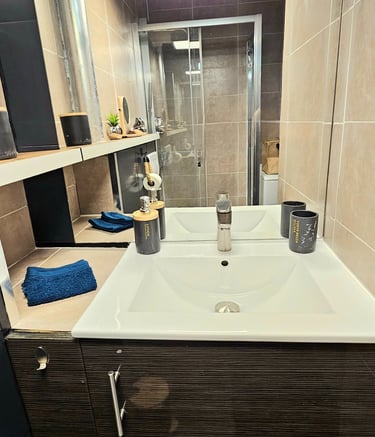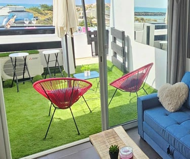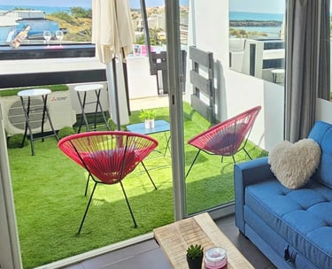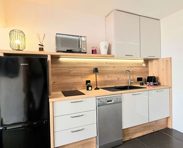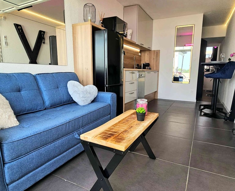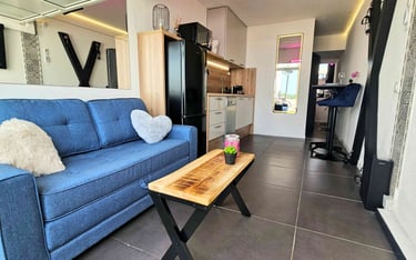 Appartement entièrement équipé, offrant tout le confort nécessaire pour des vacances inoubliables. Salon avec canapé en tissu, climatisation réversible, TV écran plat avec chaînes françaises et étrangères, barre de son et caisson de basse Bluetooth, table basse, grand miroir éclairé. Table haute, 2 chaises tabouret/bar réglables. Éclairage et ambiance LED colorés, Croix de Saint-André. Baie vitrée coulissante avec rideaux occultants. Cuisine équipée avec plaques à induction 2 zones, combiné 2 en 1 four et micro-ondes, réfrigérateur/congélateur, lave-vaisselle, machine Nespresso, cafetière filtre, grille-pain, bouilloire. Poubelle sous évier à 1 compartiment.