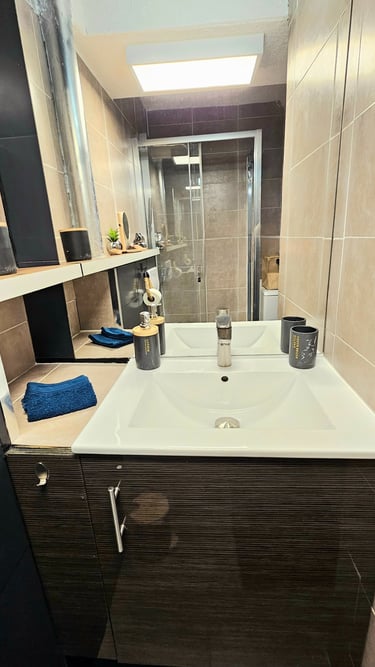 La chambre avec rideaux occultants sur fenêtre, placards suspendus, penderie d'appoint. Literie confortable, matelas et sommier neufs 140 x 190 en Aloe Vera, draps en coton fournis. Une Salle d'Eau entièrement rénovée avec douche 90x100, WC suspendu, lavabo 1 vasque, sèche-cheveux.